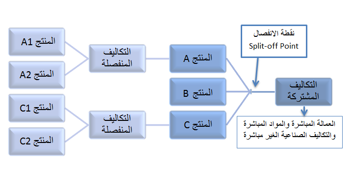التكاليف المشتركة (Joint Cost) هى تكاليف يتم تحملها قبل نقطة الفصل Split-off Point بالإضافة الى كونها تكاليف يصعب ربطها .. لا يمكن تتبعها .. بشكل مباشر بالمنتج لهذا يجب توزيعها.التكاليف المنفصلة (Separable cost) هى تكاليف تأتى بعد نقطة الفصل Split-off Pointوتخص منتج محدد