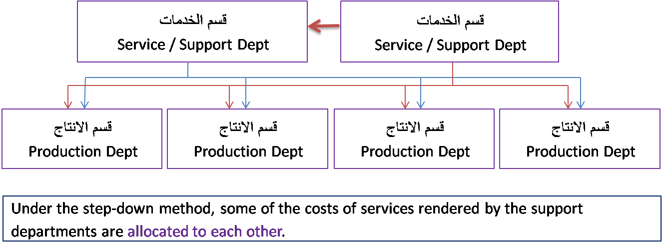 2. طريقة التوزيع التنازلى (step-down method).هى عملية تسلسلية وهي طريقة أكثر تعقيداً بشكل قليل من الطريقة المباشرة ولهذا فهى أكثر دقة.يتم توزيع تكاليف أقسام الخدمات بالترتيب (in order) .. من القسم الذي يوفر أكبر عدد من الخدمات إلى اقسام الخدمات الأخرى وصولاً إلى المستوى الذي يقدم اقل خدمة.ومع كل عملية توزيع يتم توزيع تكاليف أقسام الخدمات لكل من اقسام الخدمات المتبقية والاقسام الإنتاجية.