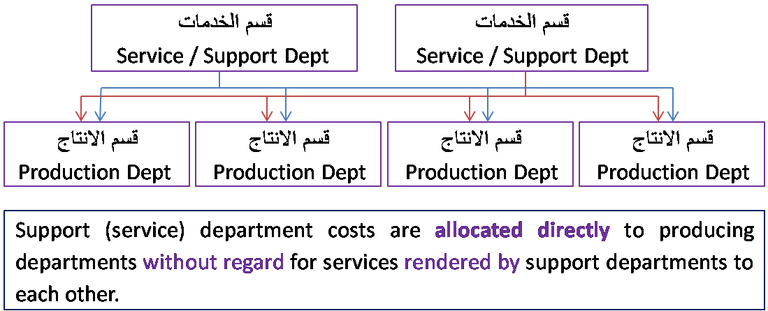 توزيع تكاليف إدارة الخدمة :من الامثلة على الادارات الخدمية : قسم المحاماة , قسم المحاسبة , قسم الموارد البشرية , قسم الـ IT , قسم الصيانة.باختصار هى اقسام وادارات تقوم بالخدمة على الاقسام الانتاجية. الطريقة المباشرة (direct method) هي أبسط الطرق وأقلها دقة.يتم توزيع جميع تكاليف اقسام الخدمات بشكل مباشر لإدارات الإنتاج. لا يتم توزيع أي تكلفة لقسم خدمات مقدم لأقسام الخدمات الأخرى.