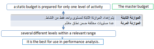 2. الموازنة المرنة Flexible budgeting :هو حساب كمية وتكلفة المدخلات التي كان ينبغي استهلاكها نظراً لمستوى الإنتاج المحقق.وبالتالى يتم إعداد الموازنة المرنة باستخدام التكاليف المعيارية والمستوى الفعلي للنشاط.تكمل الموازنة المرنة الموازنة الثابتة / الساكنة (Static / Fixed Budget) وهي أفضل توقع للشركة لاستهلاك الموارد ومستويات الإنتاج التي سيتم تحقيقها لفترة مقبلة.