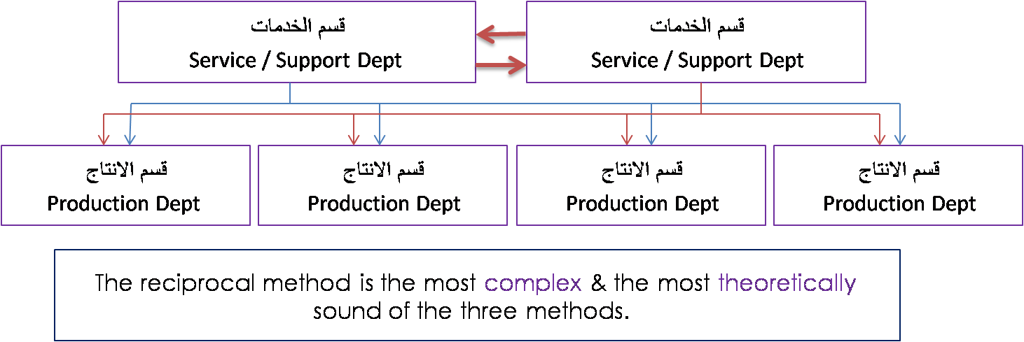 3. طريقة التوزيع التبادلى (reciprocal method) هي الطريقة الأكثر تعقيداً والأكثر دقة من بين الطرق الثلاثةتُستخدم المعادلات المتزامنة (Simultaneous equations) لتخصيص تكاليف كل قسم خدمى بين جميع الاقسام الخدمية الأخرى والاقسام الإنتاجية.
